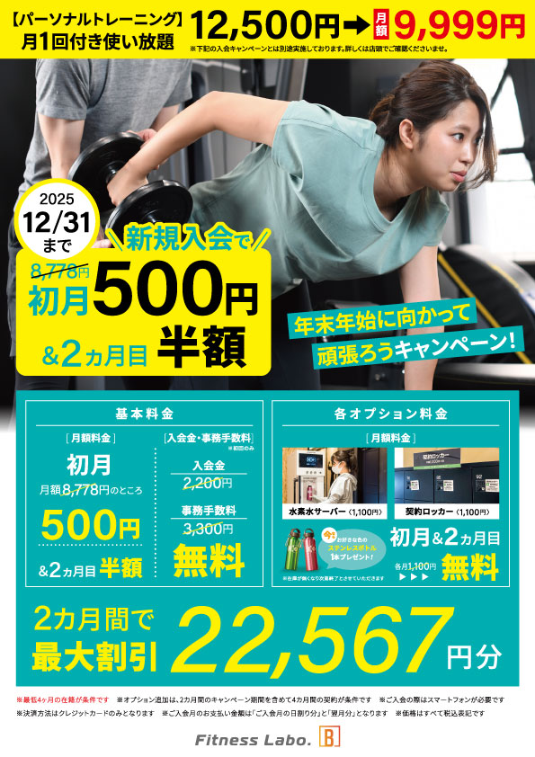 2025年12月31日まで、月額料金8,778円のところ、入会初月「500円」!2カ月目「半額」!!
